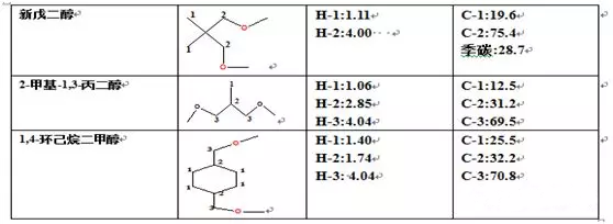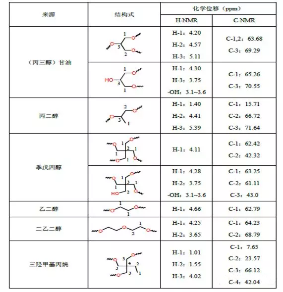 不同多元醇、多元酸(一元酸)的1H-NMR、13C-NMR化学位移、GC-MS、MS的特征出峰的总结如下: