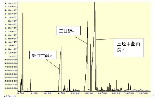 通过水解GC-MS谱图(如图1-1和图1-2所示)、水解MS谱图(图1-3所示)和样品的H-NMR和C-NMR谱图(如图1-4和图1-5),解析出酸为对苯二甲酸、邻苯二甲酸酐和己二酸;醇为新戊二醇、二甘醇和三羟甲基丙烷。